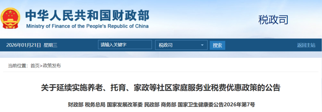 财政部、国家税务总局、国家发展改革委、民政部、商务部、国家卫生健康委20日联合发布公告,延续实施养老、托育、家政等社区家庭服务业税费优惠政策。公告自2026年1月1日起执行至2027年12月31日。
